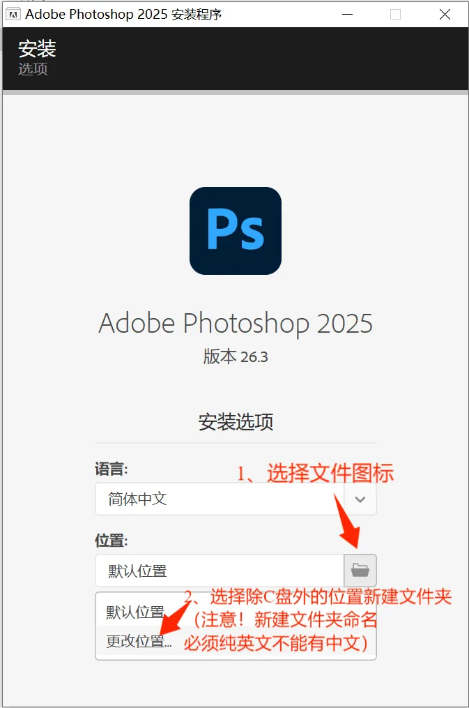 2. 选择安装位置:软件会默认选择C盘,建议大家修改到其他盘符。点击文件夹图标,创建一个纯英文路径的文件夹作为安装目录,然后点击“开始安装”。