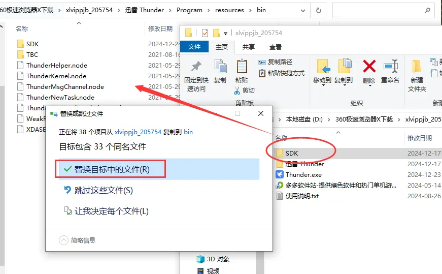 3、将下载文件中的SDK整个文件夹(Thunder\Program\resources\bin\SDK)复制到迅雷11同目录下(Program\resources\bin\SDK),接着将“Thunder.exe”程序复制到(Thunder\Program)目录下进行替换。