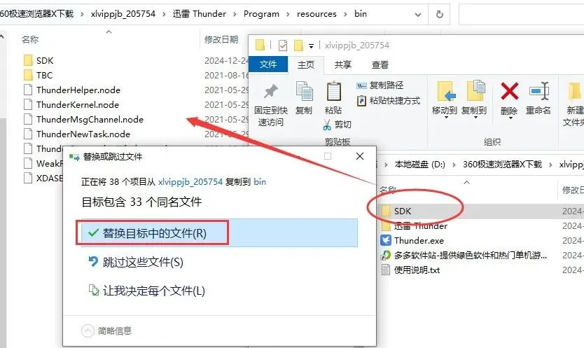 3、将下载文件中的SDK整个文件夹(Thunder\Program\resources\bin\SDK)复制到迅雷11同目录下(Program\resources\bin\SDK),接着将“Thunder.exe”程序复制到(Thunder\Program)目录下进行替换。