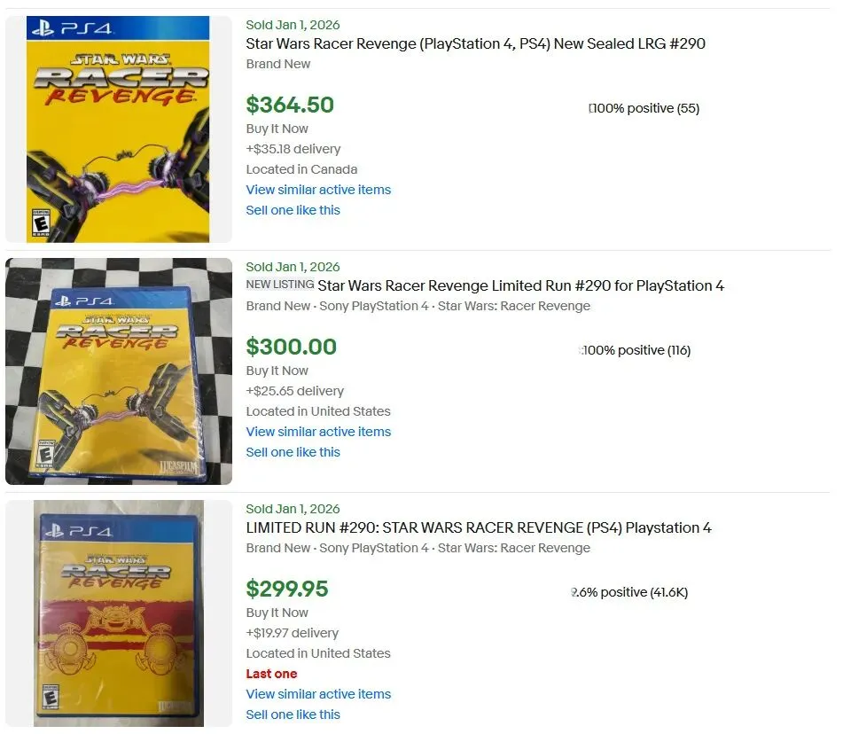 实体盘售价飙升至数百美元】因此前有报道披露,利用冷门竞速游戏《星球大战:极速飞梭》游戏漏洞可实现PS5越狱,该游戏实体盘近期在eBay上的成交价已飙升至数百美元。《星球大战:Racer Revenge》最初于2002年在PlayStation 2平台发行,后由Limited Run Games重制推出PS4版,据信产量仅约8,500套。就在上周之前,该游戏在eBay上的单盘售价仍维持在20美元左右。