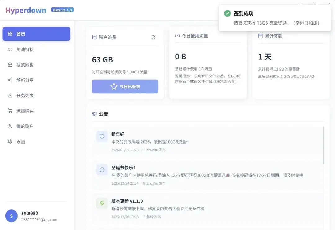 2、默认送50GB高速下载流量,有个每天签到功能,点击签到会送5-30GB,对于一般人来说完全够用了,每天签到每天白嫖。