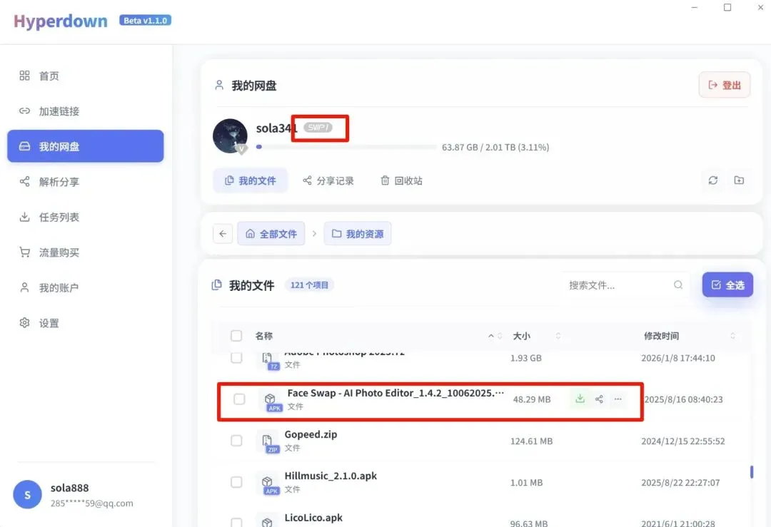 然后可以看见自己网盘里面文件,我是没有vip的,点击下载按钮可以下载。