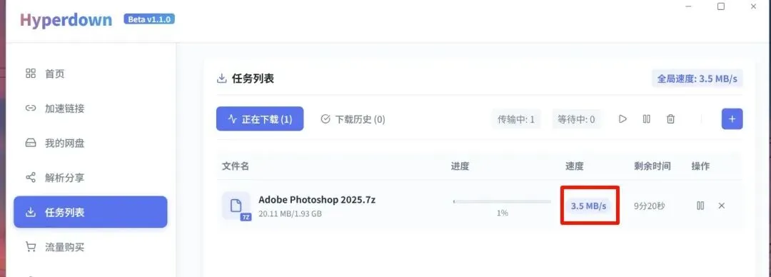 4、任务列表里面可以看见下载进度,我这边wifi不太好,我看有人可以达到100MB/S,网速多快下载速度有多快!