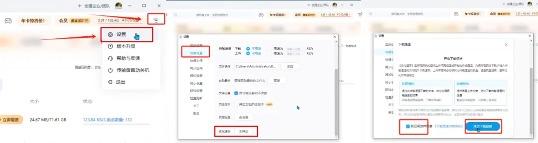 我们只需要点击右上角这个图标,选择设置-传输设置-接着往下滑,在优化速率这一栏点击去开启,勾选我已阅读并同意,再点击开启下载提速,现在你下载文件的速度就会快的飞起,非常实用。