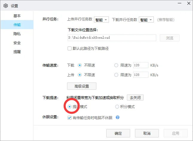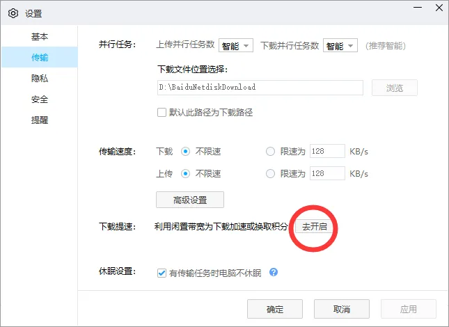 首先将我们的百度网盘升级至最新版,在“设置”→“传输”标签下,看到这项新增加的“下载提速”功能。