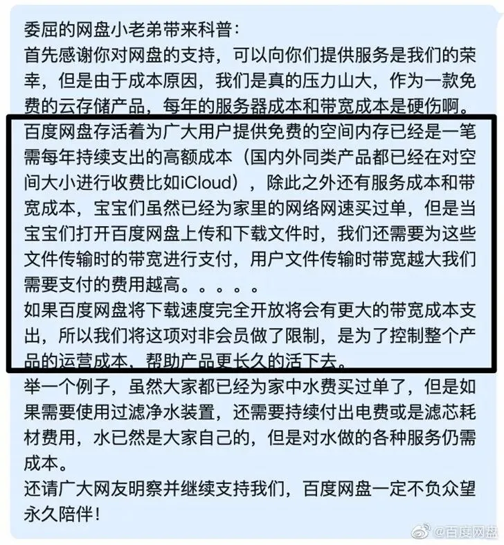 对此,百度网盘在6月6日针对网友们提出的“不充值限速”问题进行回应,表示由于成本原因,压力山大。