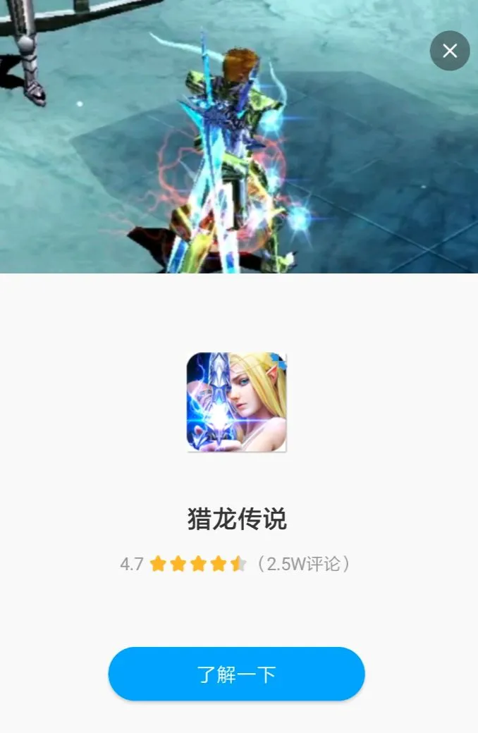 广告结束后都会弹出一个界面,点击右上角的X回到下载界面,点击其他地方,进入广告详情界面。