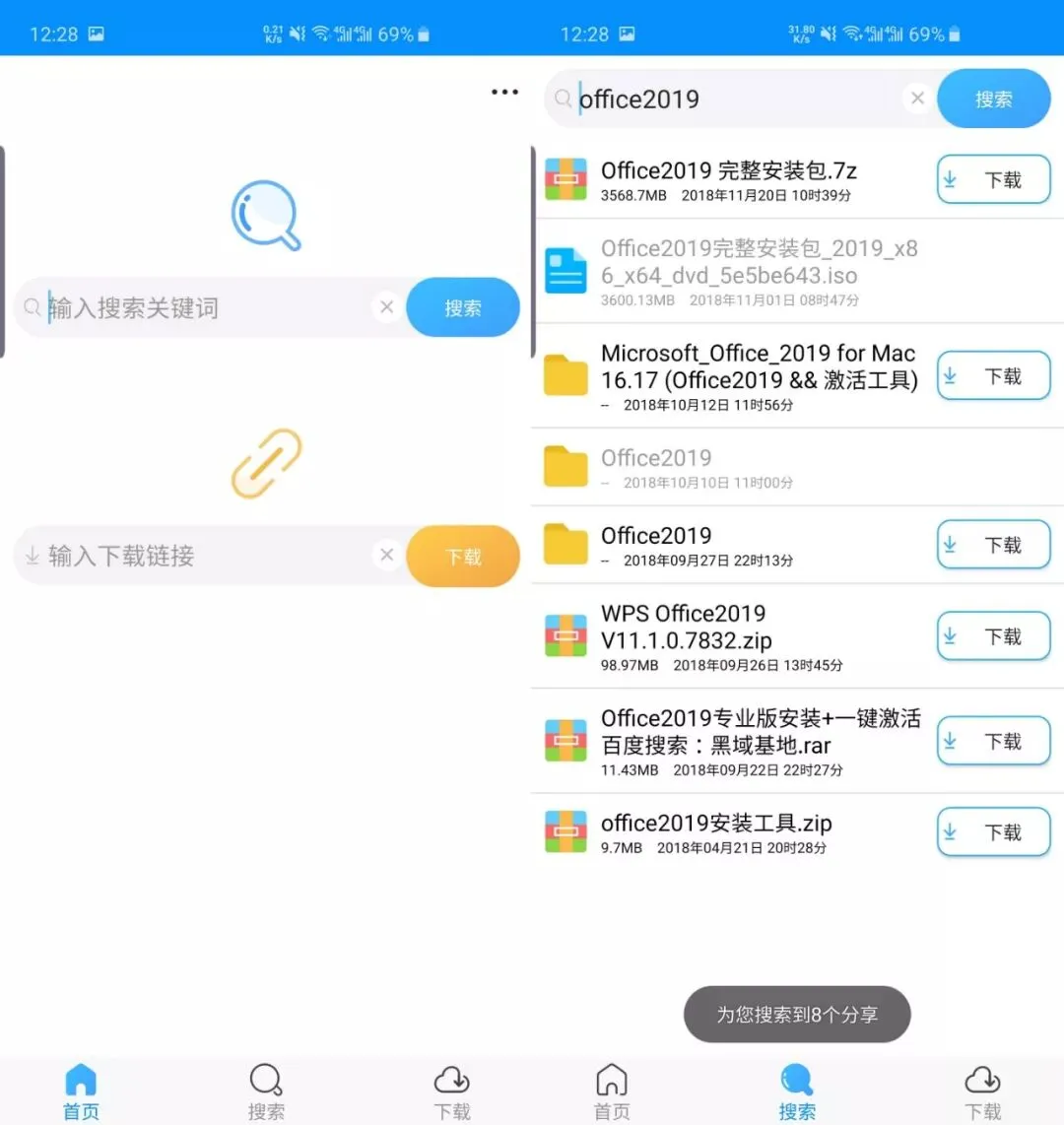 软件自带网盘资源搜索功能(我爱搜盘)。搜索到的资源可以直接下载。