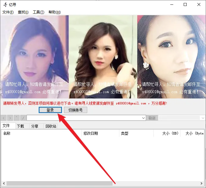 这个软件的名字叫亿寻,作者开发这款软件的目的是为了寻找某个人,也是作者写次程序的唯一目的,如果大家有线索可以发送邮箱给作者。