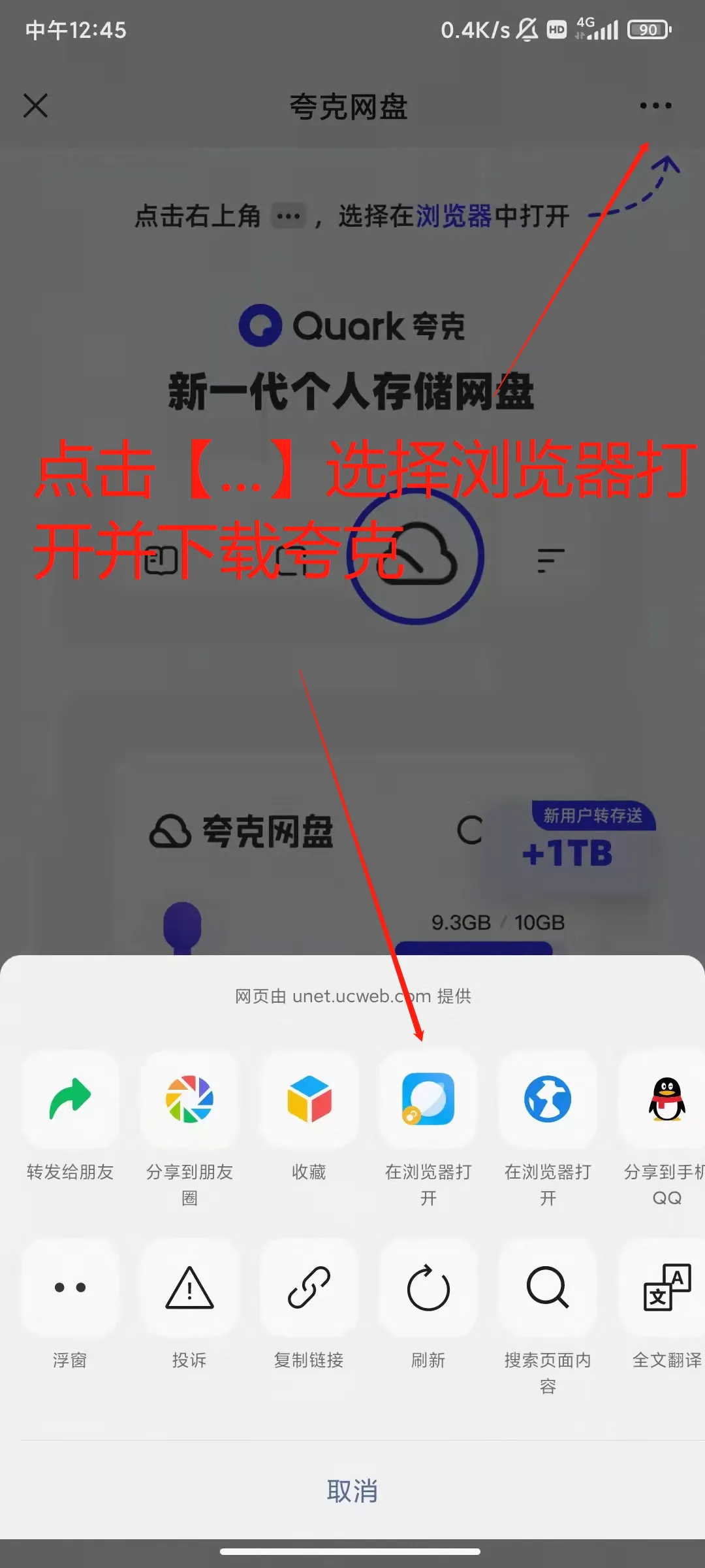 新用户点击右上角【...】选择浏览器打开下载夸克APP