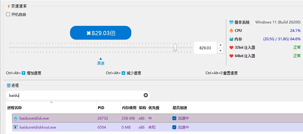 OpenSpeedy 支持针对指定进程进行时间倍率调整,而非全局系统加速。 这种方式可以在不影响系统稳定性的前提下,仅对目标程序生效,适用于: