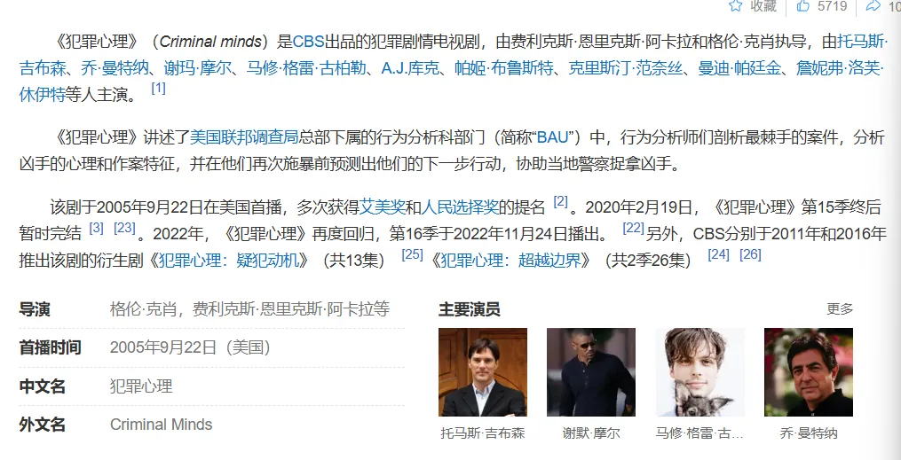 注:《犯罪心理 演变Evolution》16季到17季,18季缺
