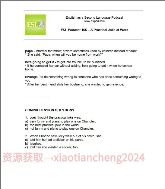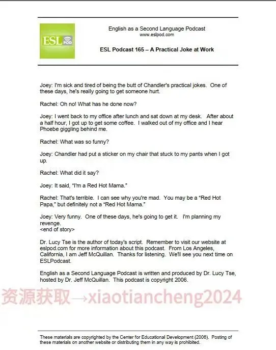 ESL Podcast 的节目结构相对固定,通常包括以下几个部分: