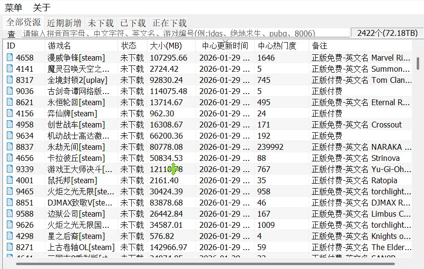 目前已经收录了 2400 多款游戏,不管是单机、联机,还是一些常见网游,基本都能直接搜到。每个游戏都会标注清楚名称、体积、更新时间和热度,值不值得下,看一眼就有数。