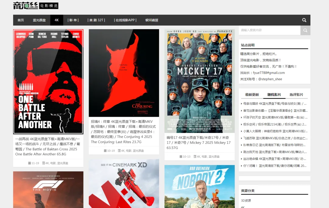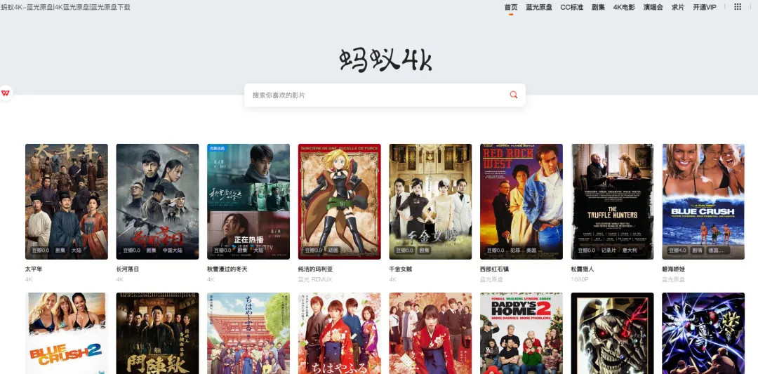 国内权威的蓝光和4K UHD资源平台,是高清发烧友的必备站点。资源涵盖最新院线大片、经典老片的蓝光原盘、杜比视界版本,支持多种画质选择,从720P到4K应有尽有,部分资源还附带多语言字幕和幕后花絮。
