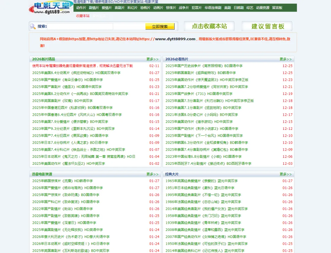 与电影天堂齐名的老牌平台,十年如一日保持优质服务,同样主打无广告、直链下载的清爽体验。资源覆盖国内外影视全品类,分类清晰明了,支持4K高清资源直接下载,电视剧板块贴心提供单集和打包两种下载选项,追剧更灵活。