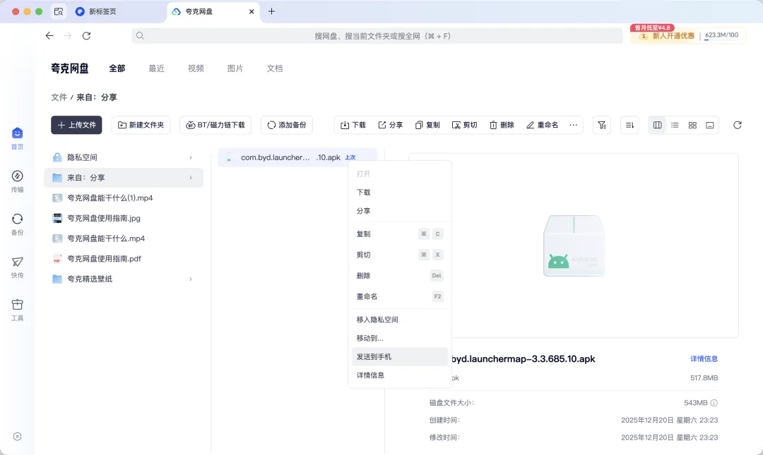 2. 保存后,在网盘中的【来自:分享】文件夹下即可看到刚才保存的文件。选中需要下载的文件,右键选择【发送到手机】