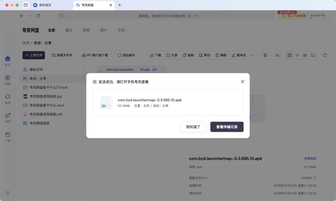 3. 发送成功,此时并不需要打开手机夸克。直接点击【查看传输记录】即可