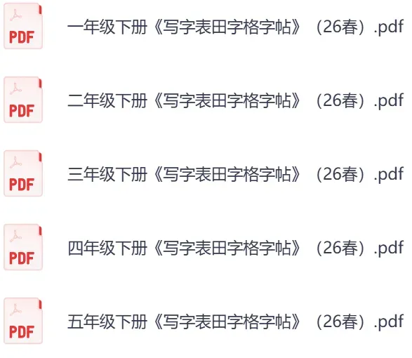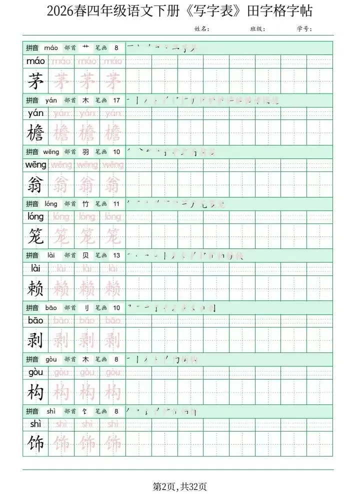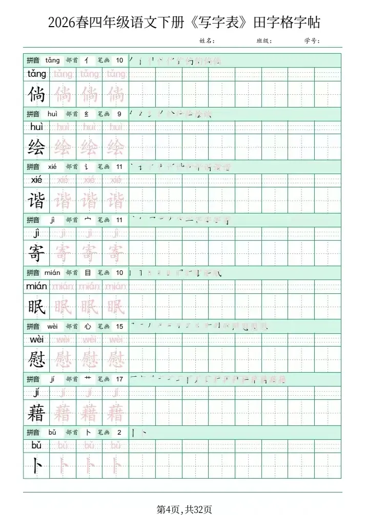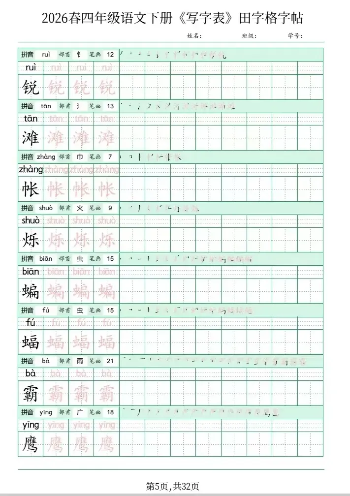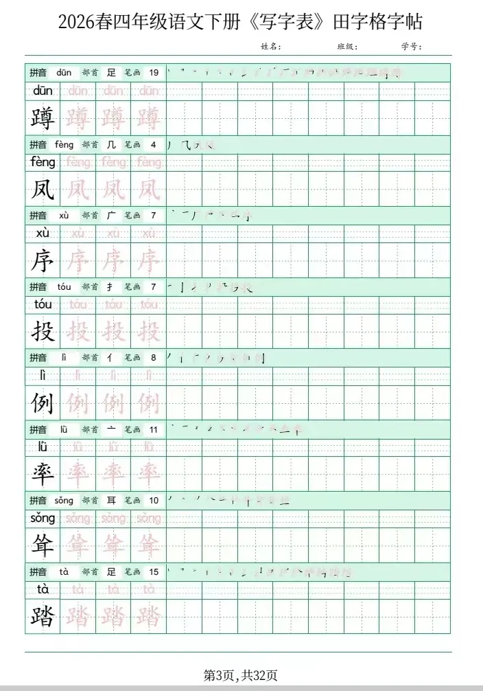 四年级语文下册《写字表》田字格字帖,网盘下载(2026春最新版)
