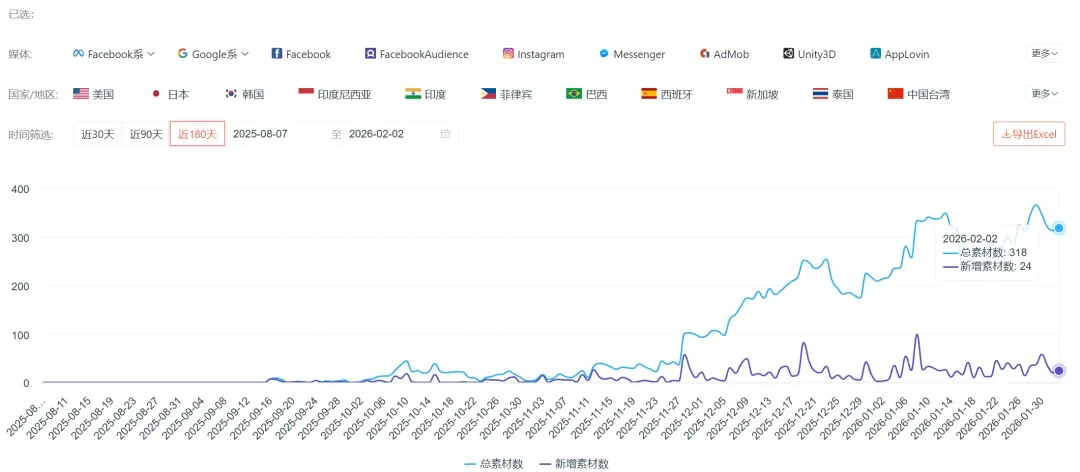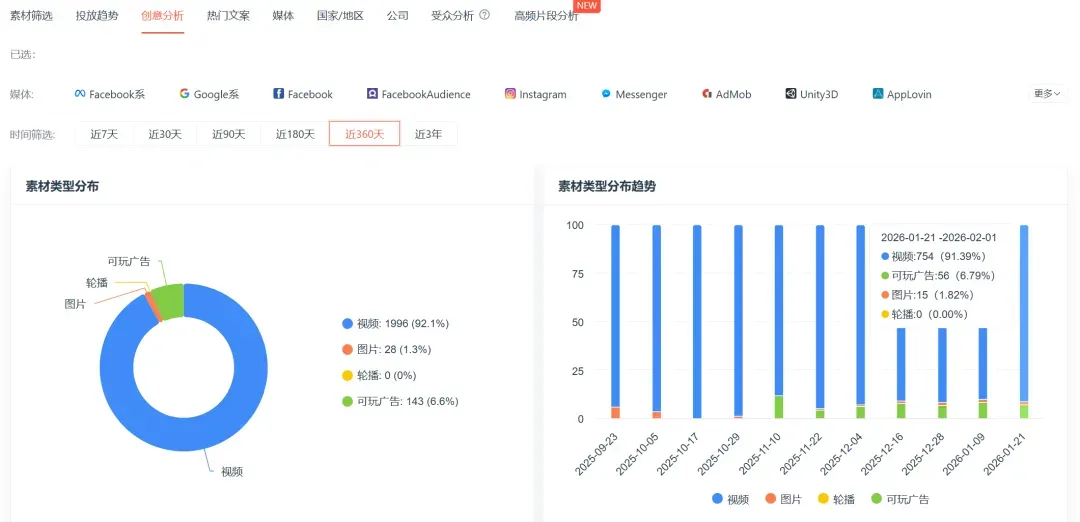 投放方面,根据 Dataeye ADX 数据显示,《纸牌接龙-单字游戏》近期投放素材规模约 300 条,投放力度明显加大的时间节点在 11 月下旬。素材方面,《纸牌接龙-单字游戏》的累计视频素材接近 1700 条,其中试玩广告大约 100 条,占比约 10%,且初次加入试玩广告的时间节点也恰好与游戏日均下载量激增4倍的时间节点一致。