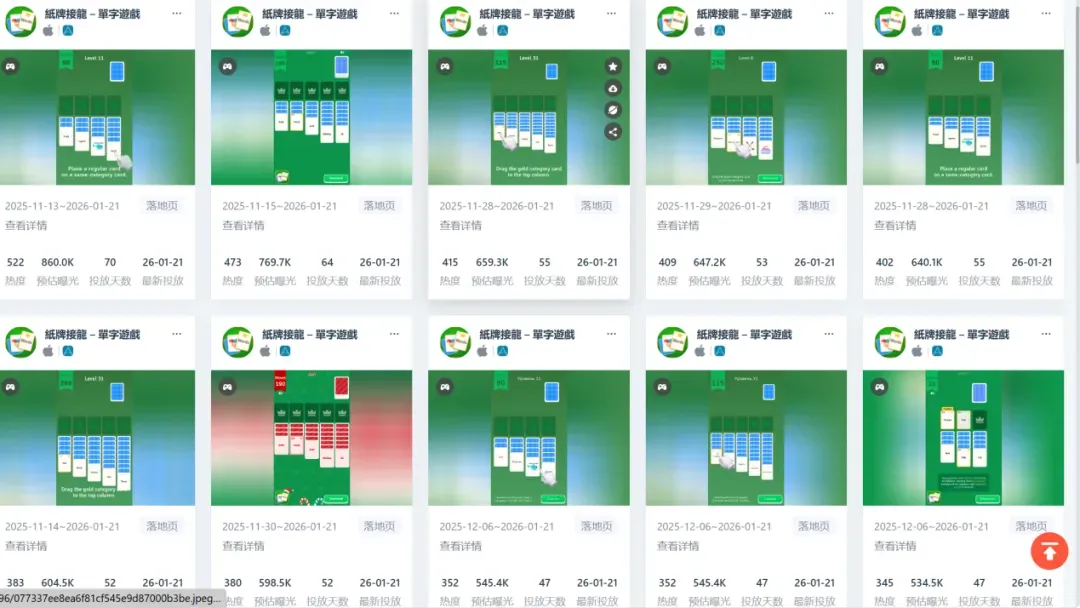 素材方面,《纸牌接龙-单字游戏》的广告视频素材均为游戏实机玩法下制作的素材视频。但值得一提的是,《纸牌接龙-单字游戏》的试玩广告与其他基于实机玩法下制作的广告投放素材保持高度一致性。