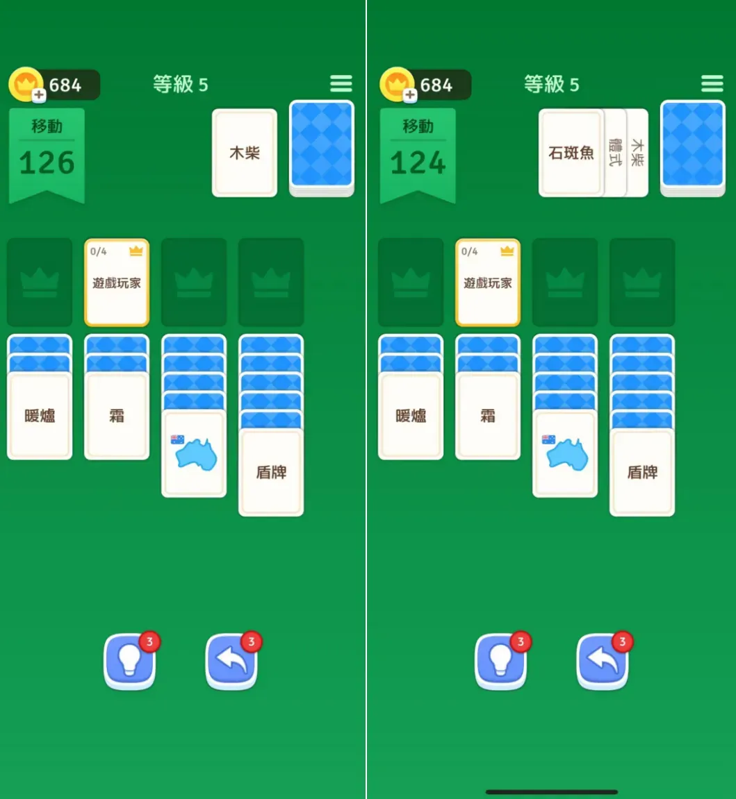 第二个难度特征,在类型牌设计。在《纸牌接龙-单字游戏》内,词汇设计在难度递进的时候可视为模糊词。所谓模糊词,在游戏内指两种或以上的类型,又或者玩家仅通过词汇暂时无法确认词汇类别归属,亦或是词汇与词汇之间看似共同实则属于不同归类。这些词汇出现在牌组区域时,则形成了传统消除游戏的阻碍效应。该效应主要针对基于传统纸牌接龙游戏玩法的玩家,使其额外消耗 1 步将卡挪至空的牌组区域。