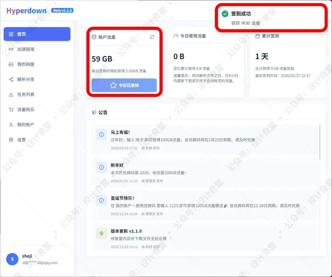 流量免费送: 每天签到即可获取 5-30GB 的下载流量。对于大多数偶尔下载资源的用户来说,这点流量完全够用。