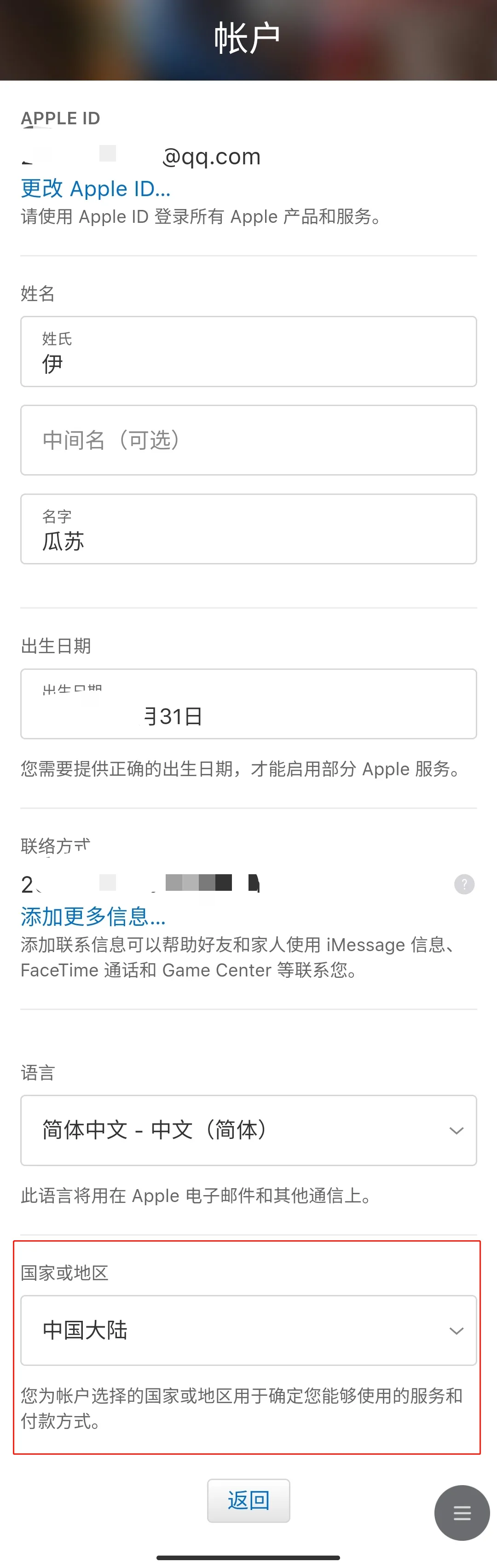 ③.进入账户界面,拉到最下方,选择你要更换的地区。