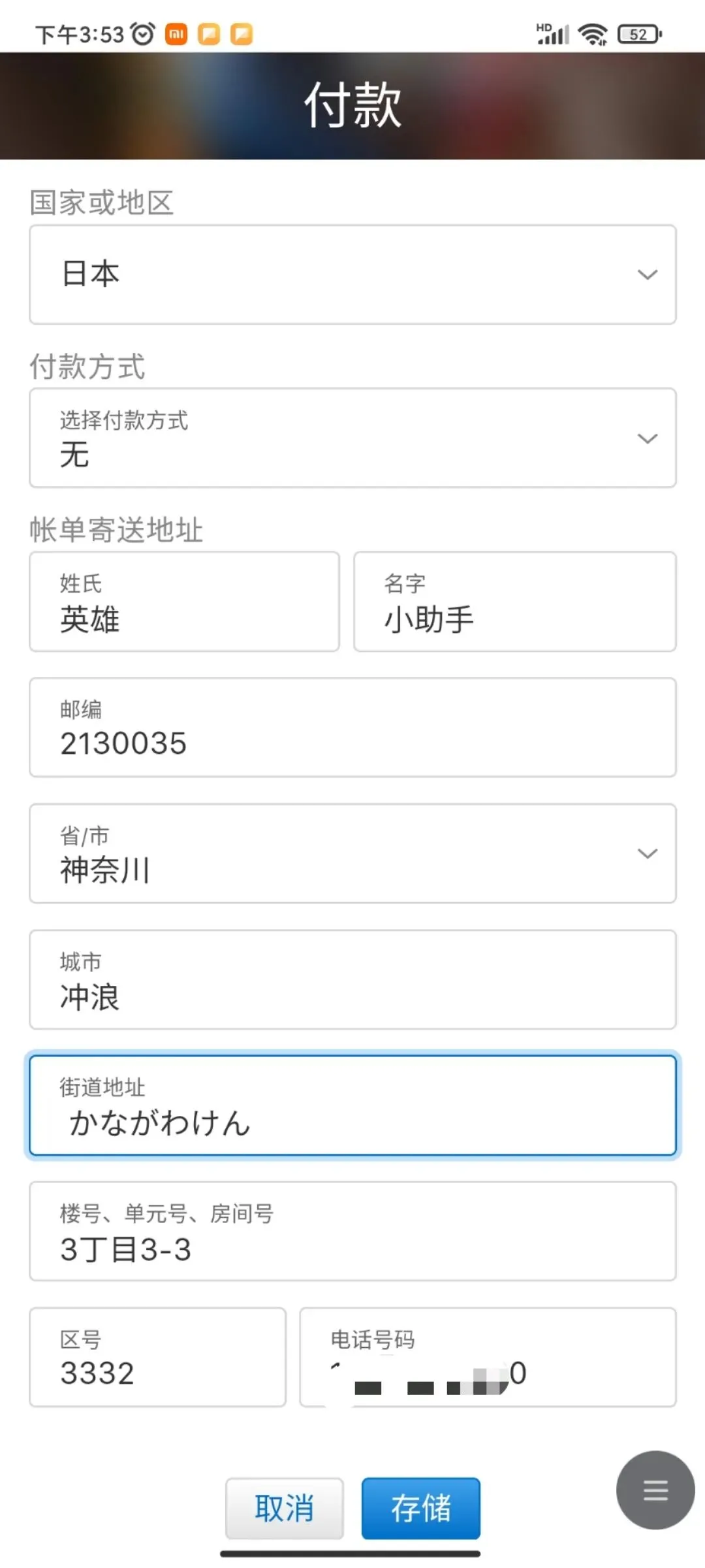 ④.跟前面注册账号的后一步一样,在“付款”界面,付款方式填“无”,姓名随便填,不知道你选的城市地址、邮政编码等百度搜索即可。填写完成后点击储存。