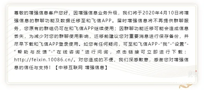 4月8日,中国移动增强信息现已发布《增强信息群聊功能迁移提醒》。《提醒》指出,因业务升级,增强信息将于2020年4月10日将群聊功能及数据迁移至和飞信。届时增强信息将不再提供群聊服务,用户原有的群组仍可在和飞信继续使用。