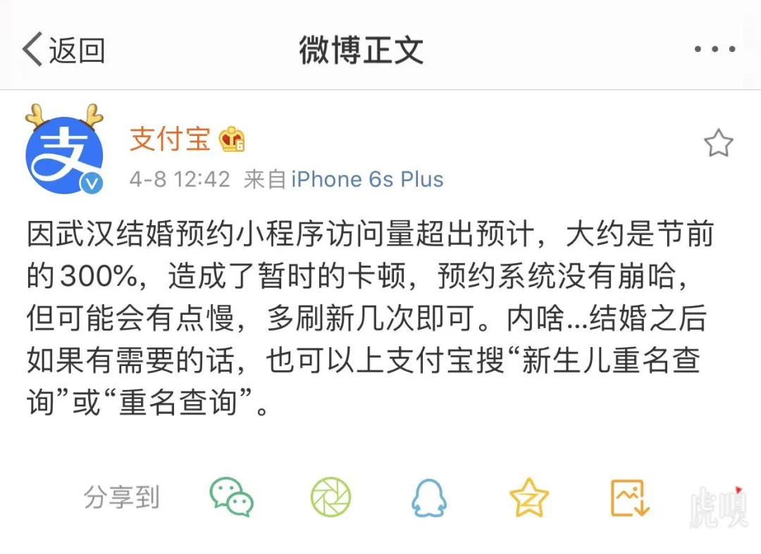 今天,武汉按下重启键。有网友爆料称大量武汉用户涌进武汉预约结婚的“鄂汇办”支付宝小程序,最终因预约人数过多,访问量过高,系统崩溃。对此,支付宝在微博做出回应:因武汉结婚预约小程序访问量超出预计,大约是节前的300%,造成了暂时的卡顿,预约系统没有崩哈,但可能会有点慢,多刷新几次即可。内啥…结婚之后如果有需要的话,也可以上支付宝搜“新生儿重名查询”或“重名查询”。