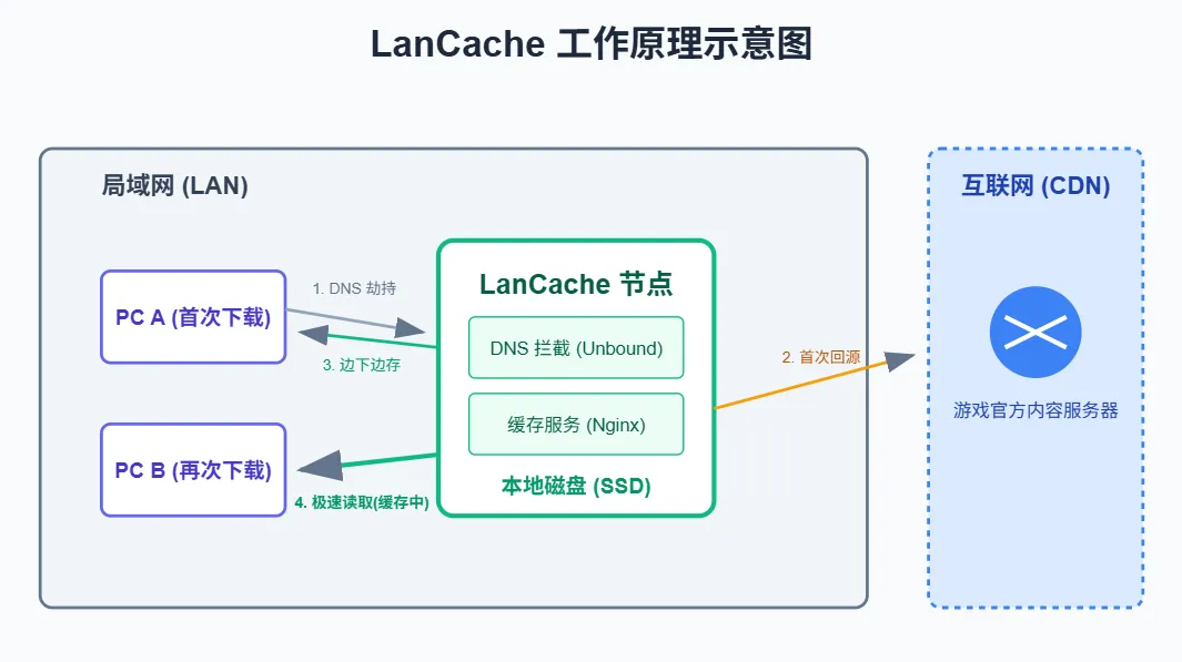 Lancache是一套在GitHub上开源免费的局域网缓存解决方案,它基于Nginx,通过DNS劫持技术,可以将Steam、EA app (原Origin)、育碧、拳头、暴雪战网等平台的下载域名解析到本地缓存服务器的IP地址,而非直接访问互联网。