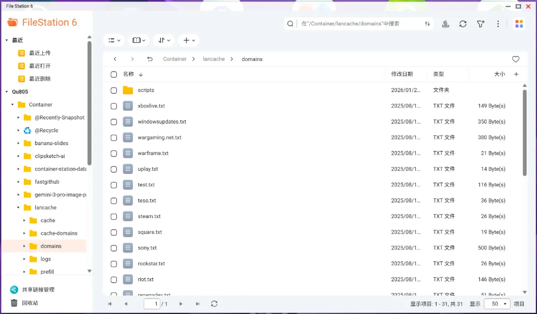 然后将解压后的所有文件都上传到NAS里,比如我存放在了/Container/lancache/domains文件夹里。