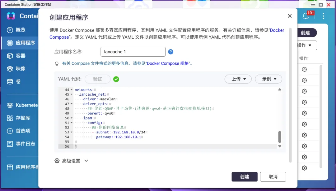 代码粘贴无误后,记得点击下方的 “验证”按钮,确保YAML格式正确,最后点击创建按钮,系统就会自动拉取这个非常精简的镜像并启动服务,咱们可以在容器列表中看到lancache-dns和lancache-monolithic这两个容器正在运行,状态显示为绿色小圆点。