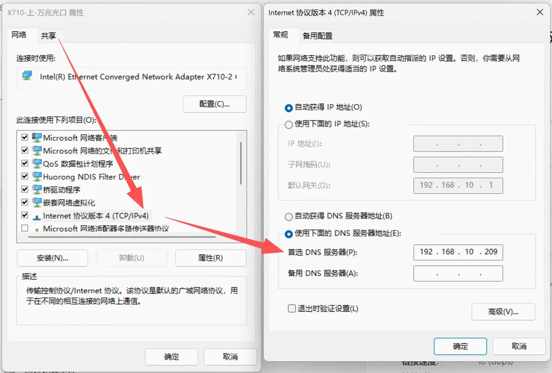 Lancache正确部署后,使用方法是非常简单的,我们只需要将电脑的DNS指向刚才我们给Lancache配置的网址即可,比如这里我使用的就是代码中的 192.168.10.209: