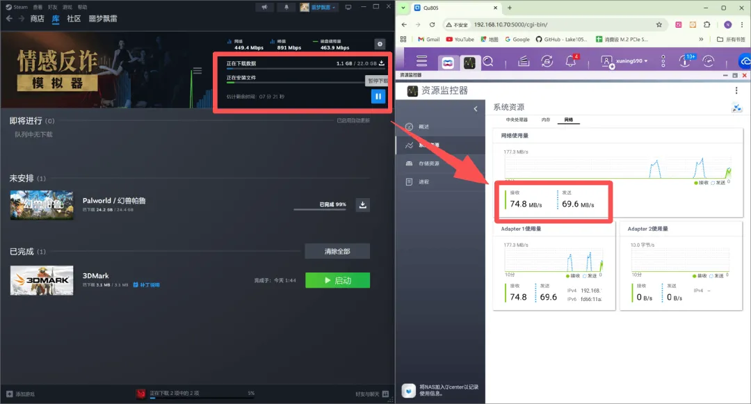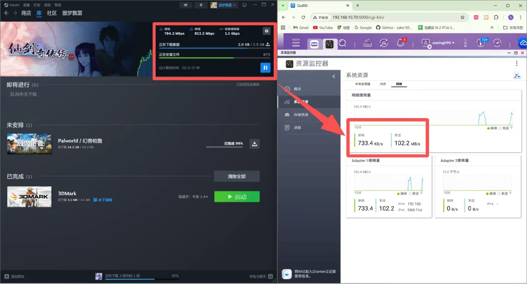 如下图所示,可以看到在首次下载游戏时,Qu805是处于边接收、边发送的状态,说明游戏文件已经流经了NAS,并且在NAS中进行了缓存。