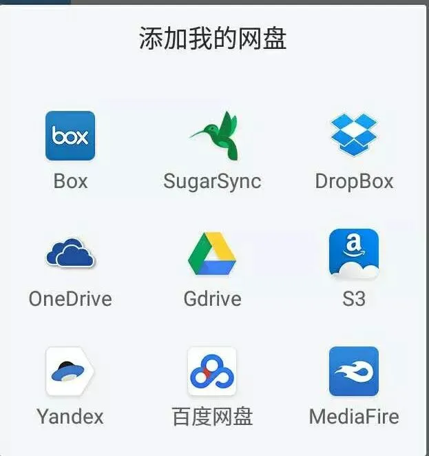 点击进去在右上角看到一个新建的按钮,点击后里面会跳出来很多网盘图标供大家选择,选择带中文字样的百度网盘就好了。