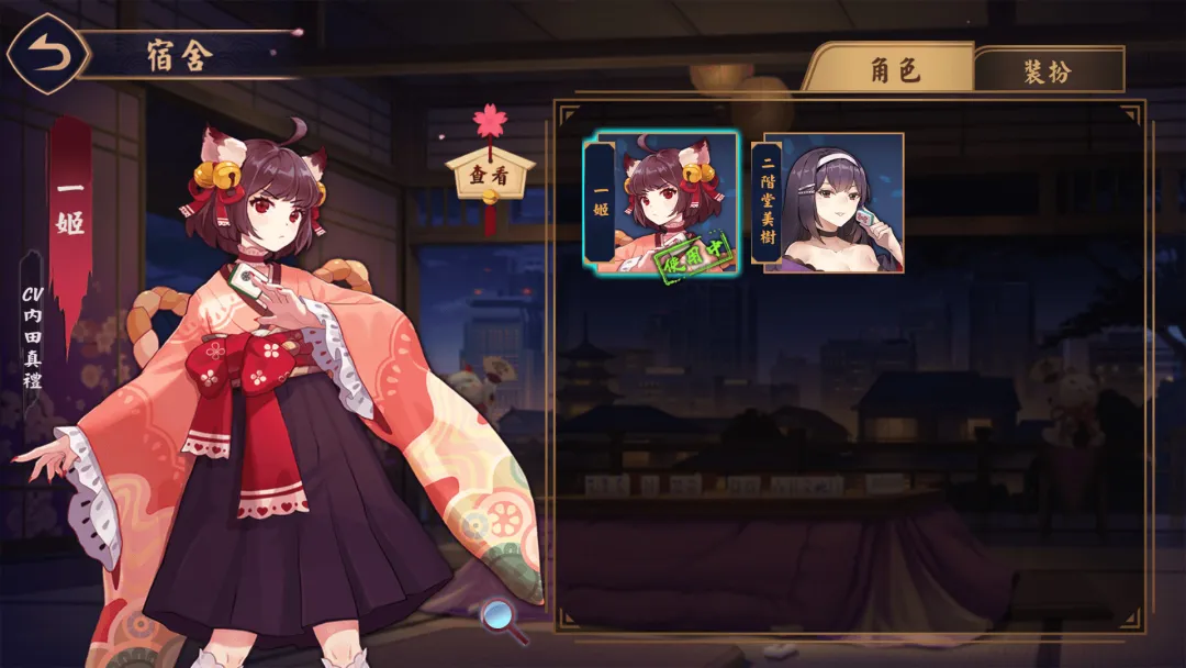 一姬(CV:内田真礼):游戏的看板娘,魂天神社的猫耳巫女。自称是人类,但谁都知道她有猫耳。口头禅是“吃饭和午睡最重要”,魔性的表情包让她成为无数玩家的心头好。