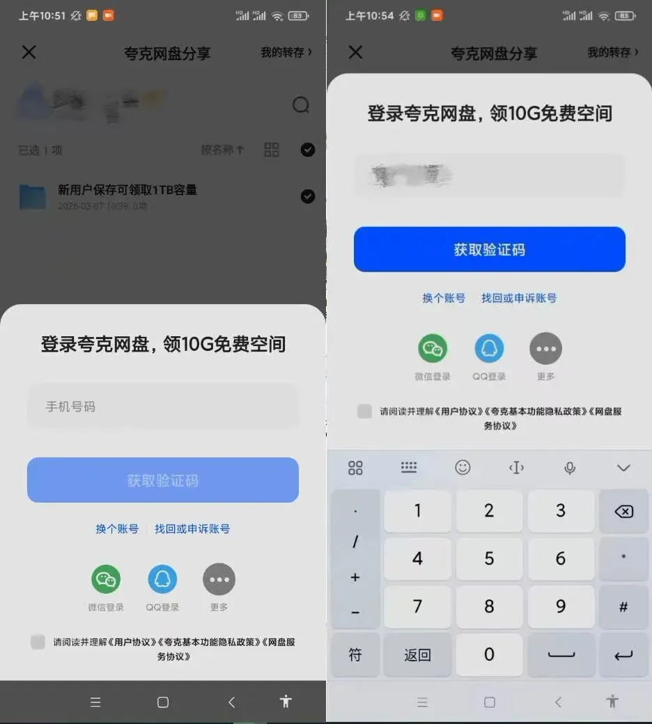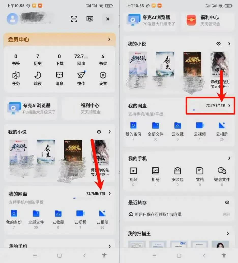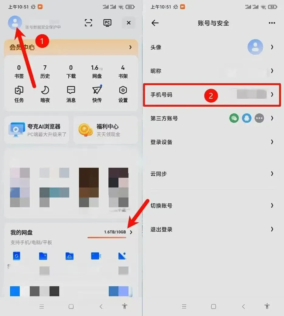 首先可以看到这里网盘容量只有10G(之前开会员扩容过,会员过期就掉到了10G),咱们点击左上角头像,选择手机号码