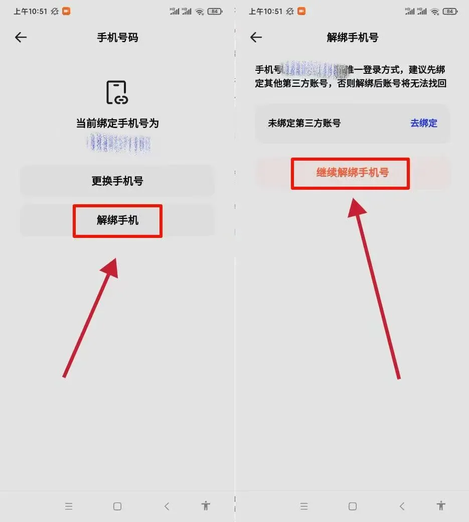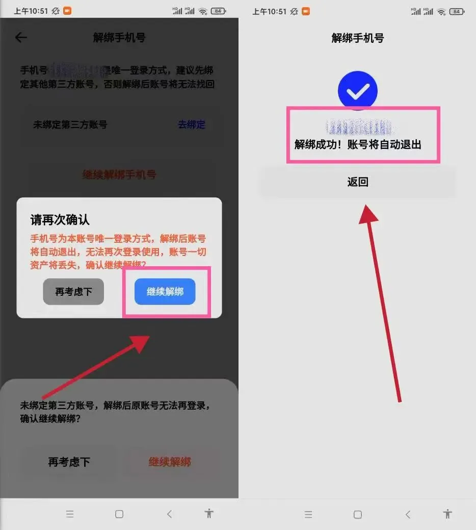 解绑过程中会出现多次确认提示,按照提示继续操作即可,直至手机号完全解绑成功。