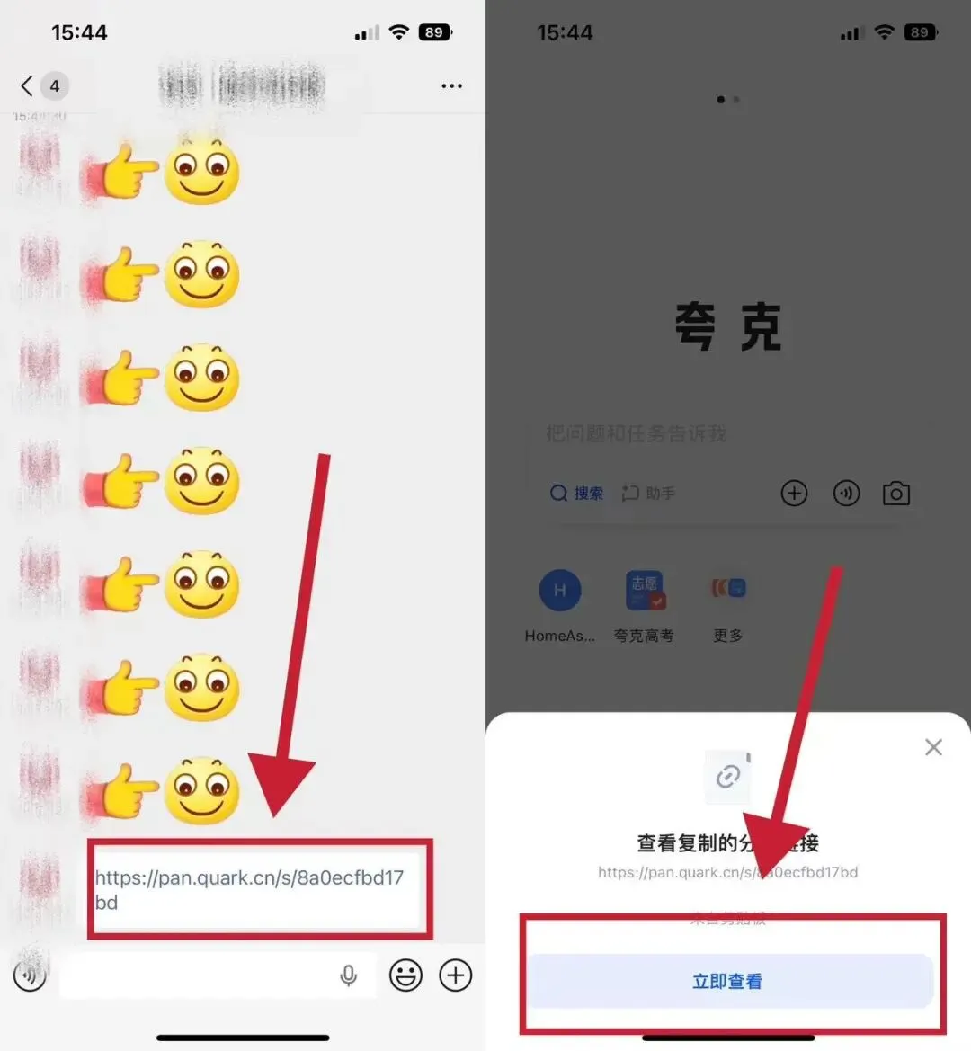 将夸克切换至后台,复制下方网盘链接,重新返回夸克,稍等片刻就会自动弹出链接资源,点击立即查看即可。
