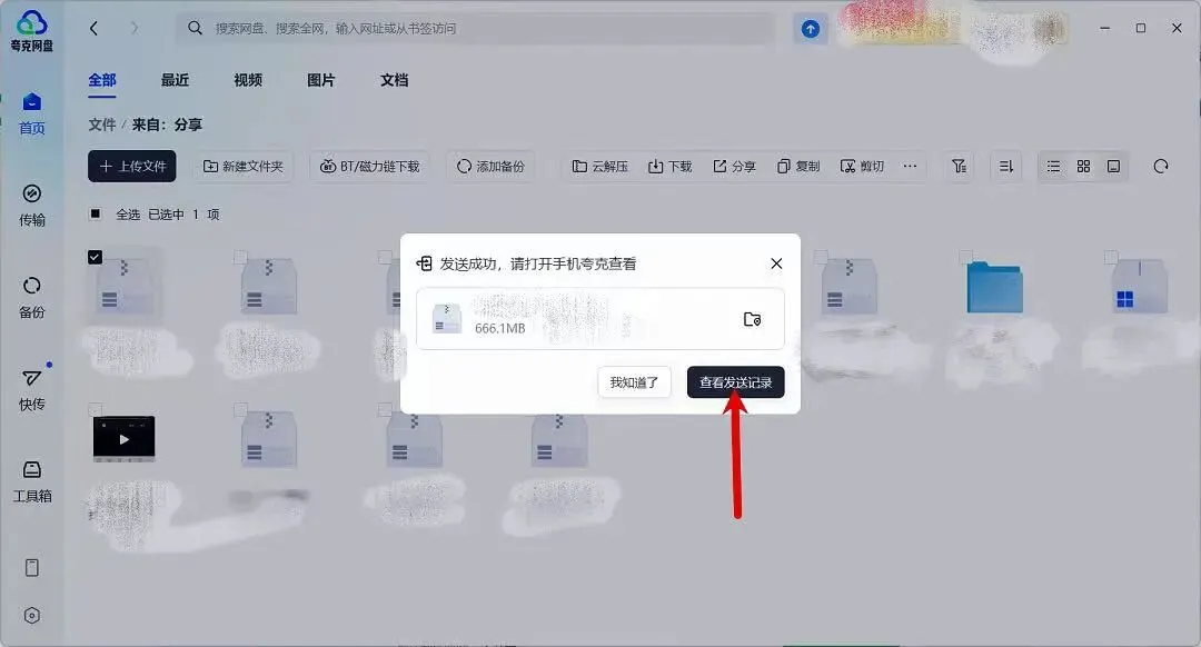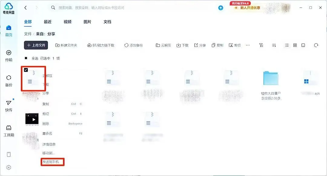 首先打开电脑端夸克网盘,右键选中需要下载的文件,选择【发送到手机】即可。