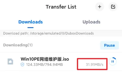 接着从手机上传了一个800M的文件,上传速度还是很快的,基本上达到了上传带宽的上限。接下来测大家比较关心的下载速度。