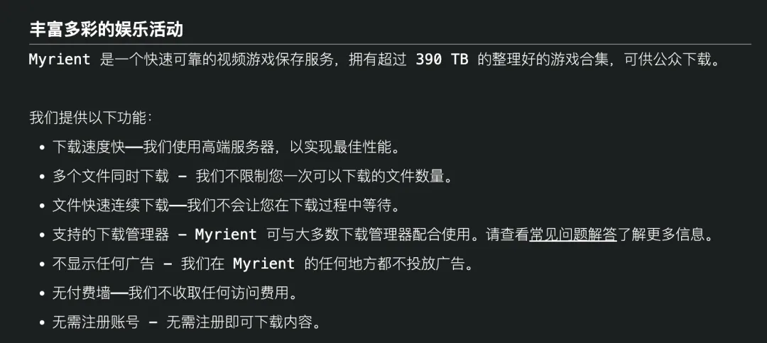 Myrient是一家致力收录于市面上找不到的实体游戏,或是冷门电子游戏的非盈利网站,游戏资源数量远超其他网站,目前全站数据突破390T,且无广告、无限速、不需会员