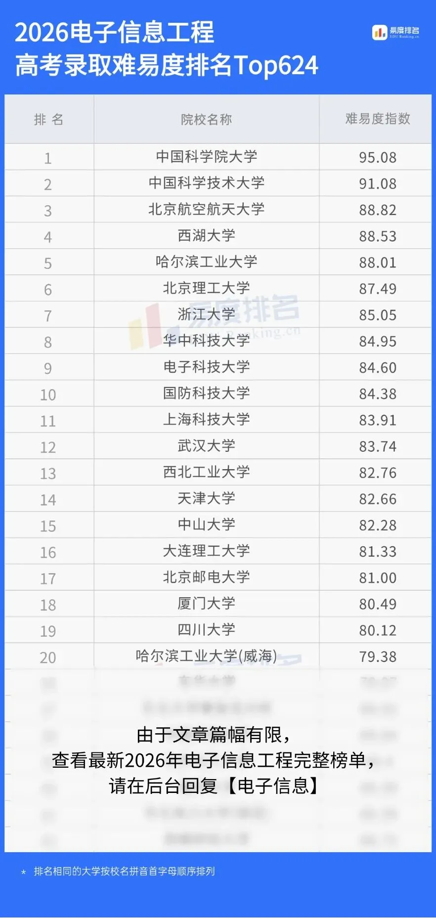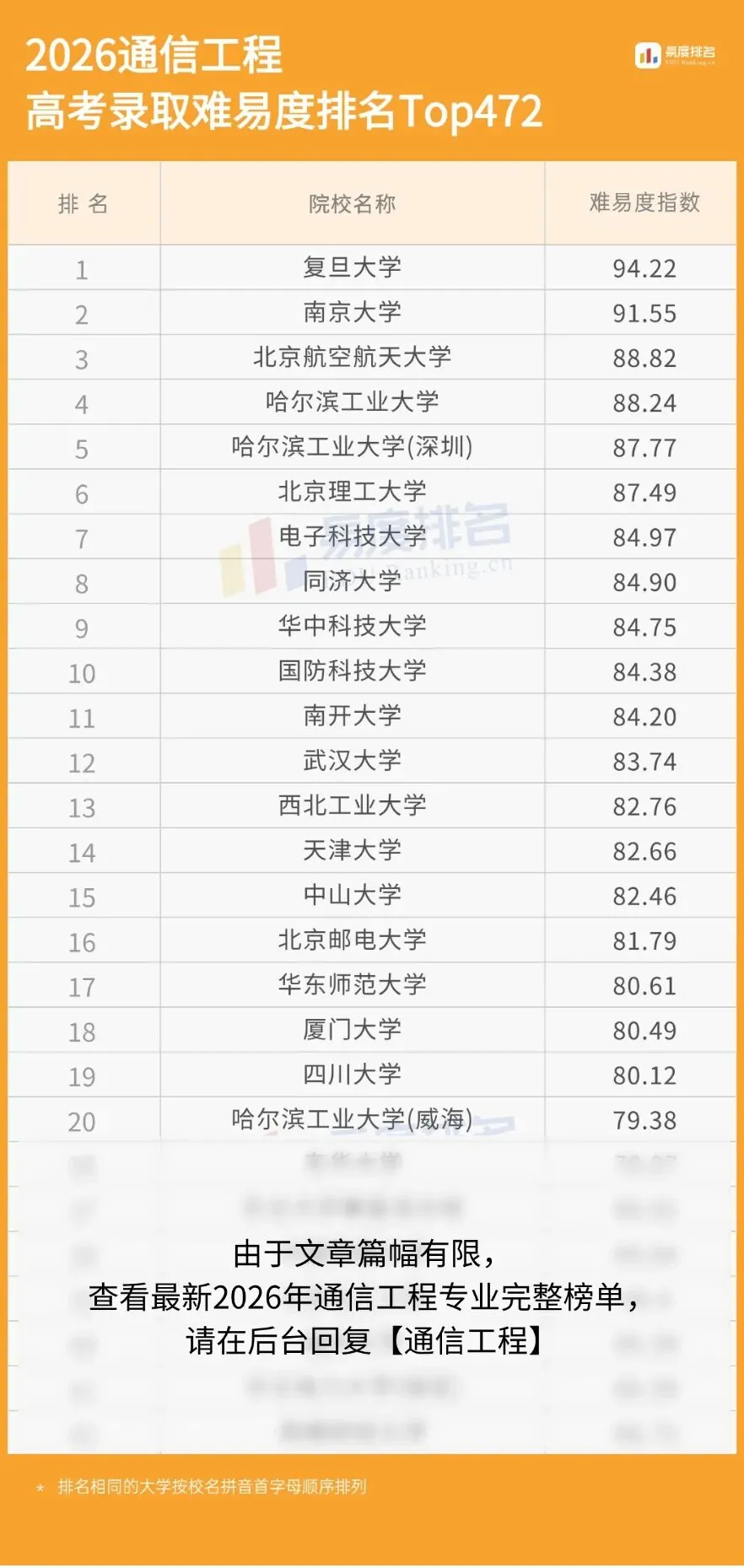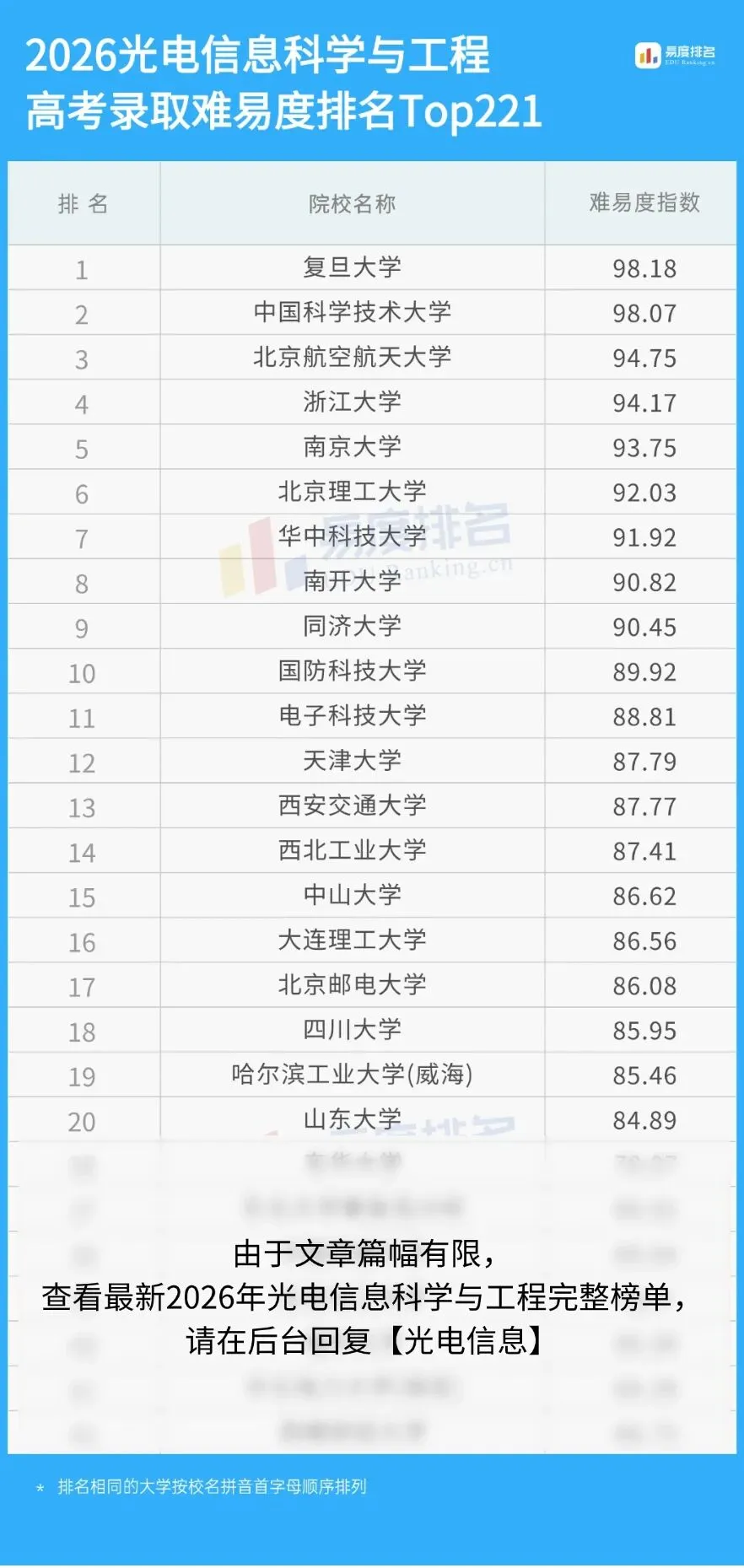 2026年易度最新大学排名已更新,想要了解更多大学的录取难度排名,进入易度排名公众号