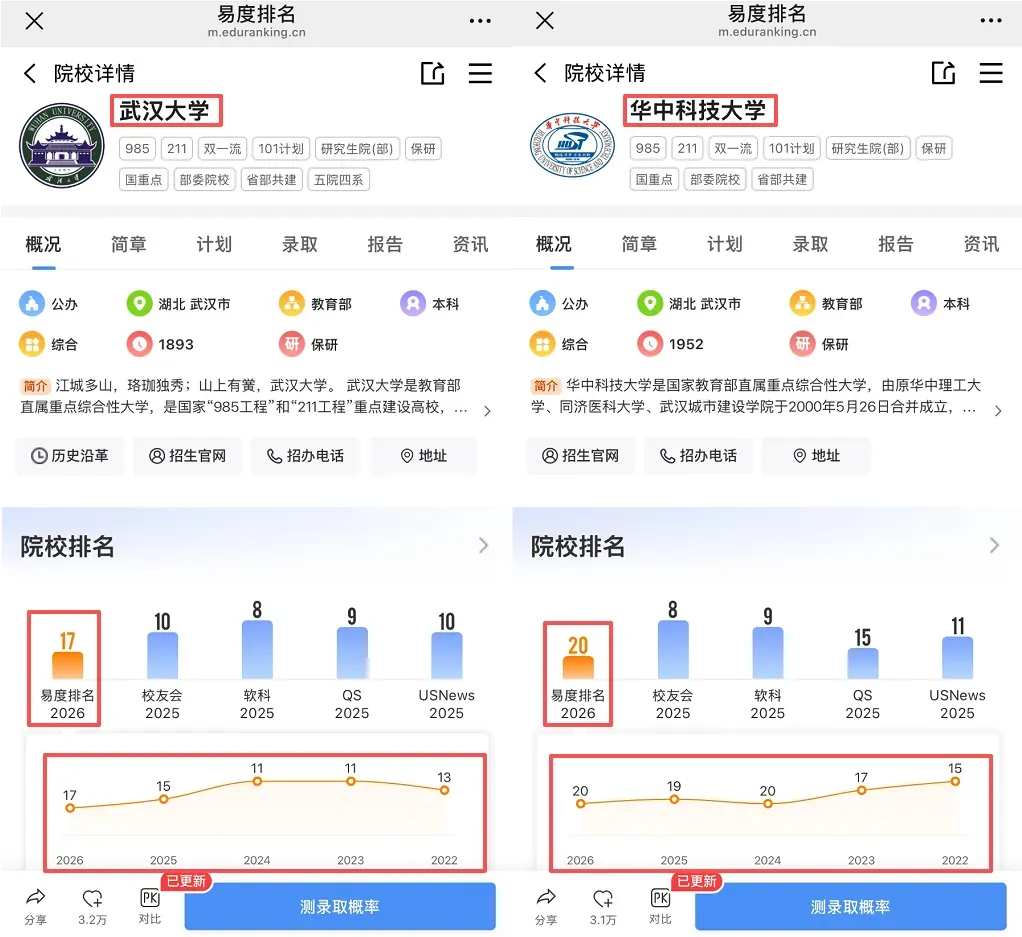 3、例如,想知道武汉大学和华中科技大学谁更难考,可在搜索栏中分别输入两所学校名称,即可得到2026年最新排名,武汉大学排名14,华中科技大学排名17,可得武汉大学比华中科技大学更难考,下方还有历年排名可参考哦~
