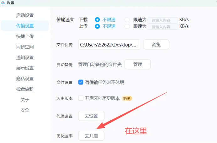点开设置,选择传输设置,找到优化速率这个按钮