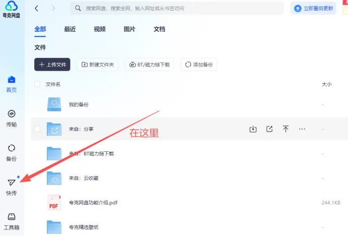 打开夸克网盘,在左侧找到快传按钮