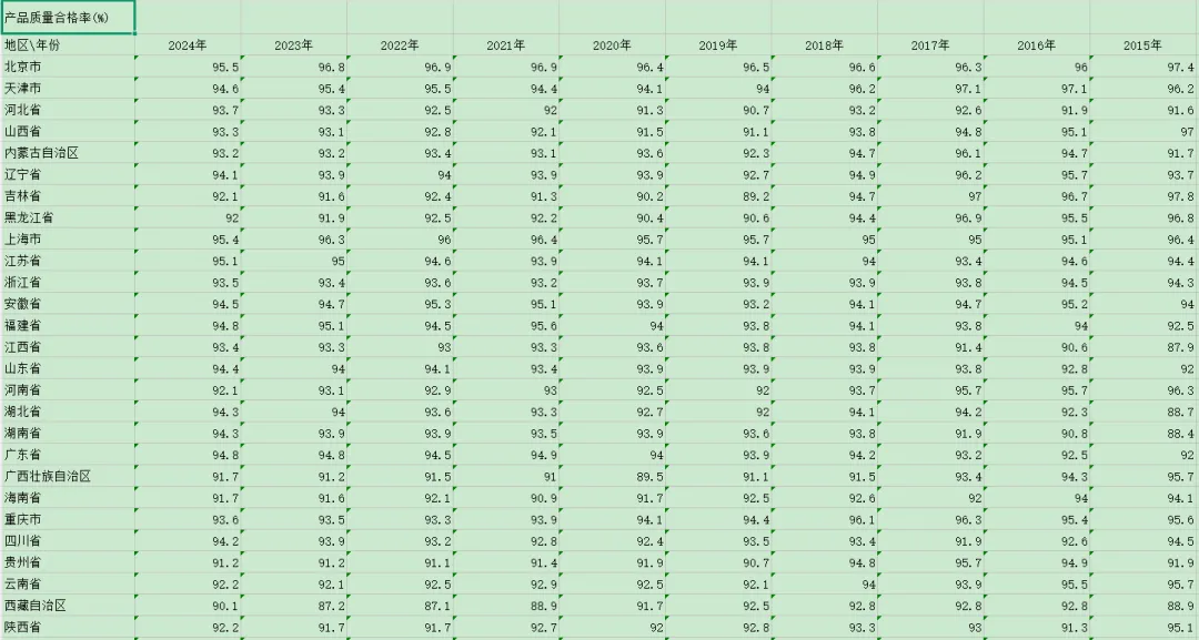 本数据集提供了中国各省级行政区产品质量合格率(单位:%)的年度统计数据,用于反映各地工业或流通领域产品质量监督抽查中的合格水平变化趋势。