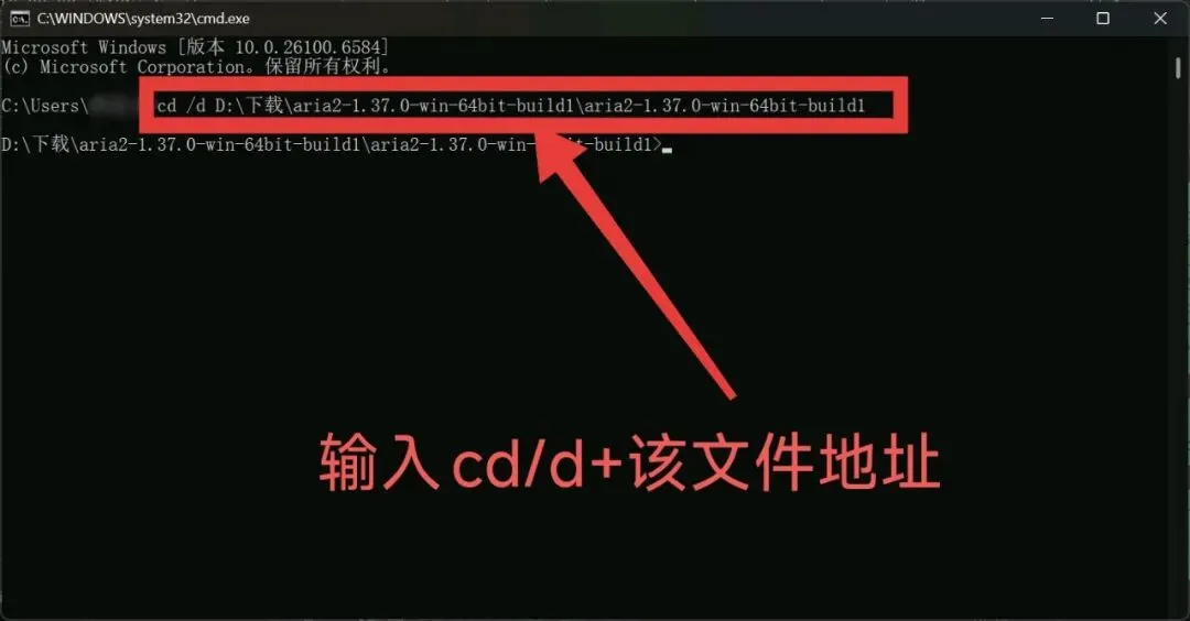 2. win+r打开新的CMD窗口,输入命令切换到aria2目录(如我的在D盘的下载里):cd /d D:\下载\aria2-1.37.0-win-64bit-build1